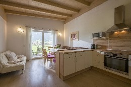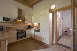 Großer Sitz- und Eßbereich mit TV und Balkon, offene Küche mit Geschirrspüler, Herd, Ceranfeld, Mikrowelle, Kaffeemaschine, Wasserkocher, Geschirr